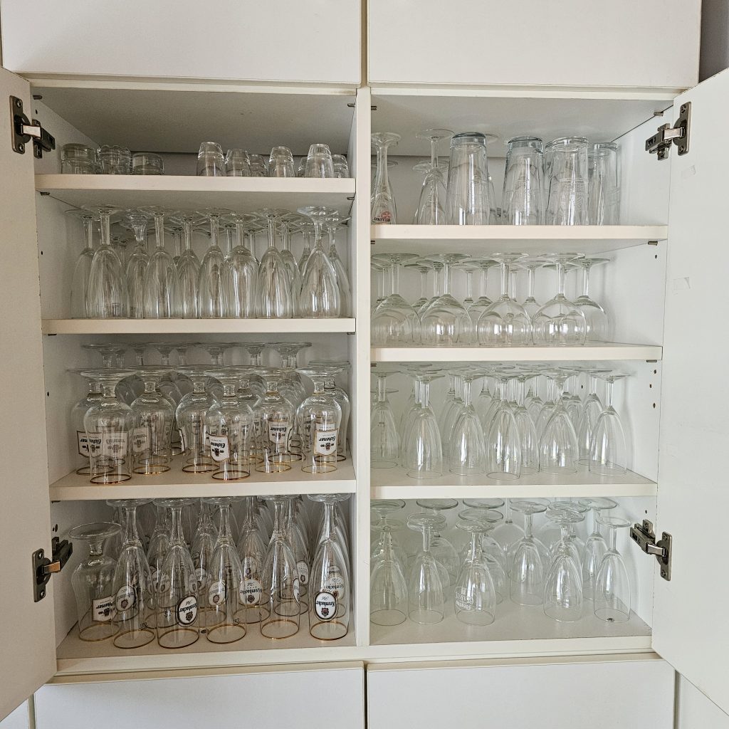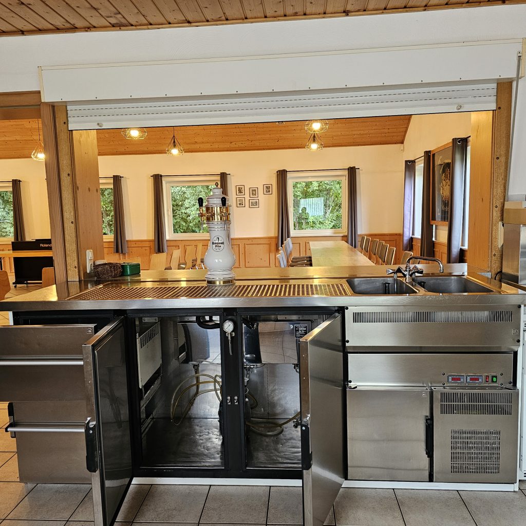 Geschirr, Gläser, Bestecke, Bestuhlung und Tische sind in ausreichender Anzahl vorhanden.